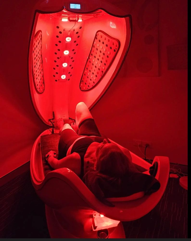 Experience the Cocoon Infrared Wellness Pod, an exclusive, reclining chamber that merges soothing dry heat, rejuvenating infrared/red light therapy, gentle vibration massage, and detoxifying Himalayan salt for comprehensive wellness enhancement.